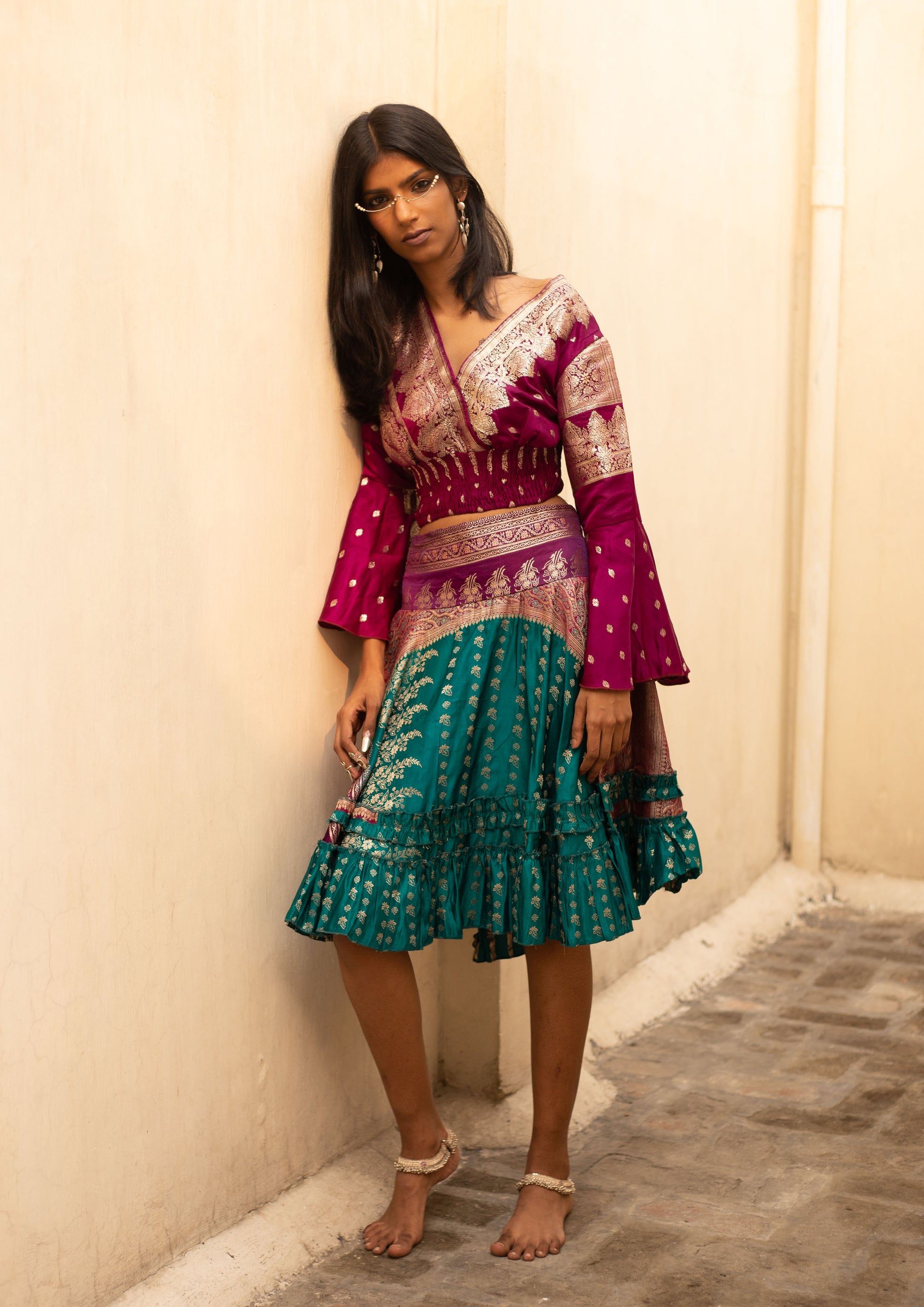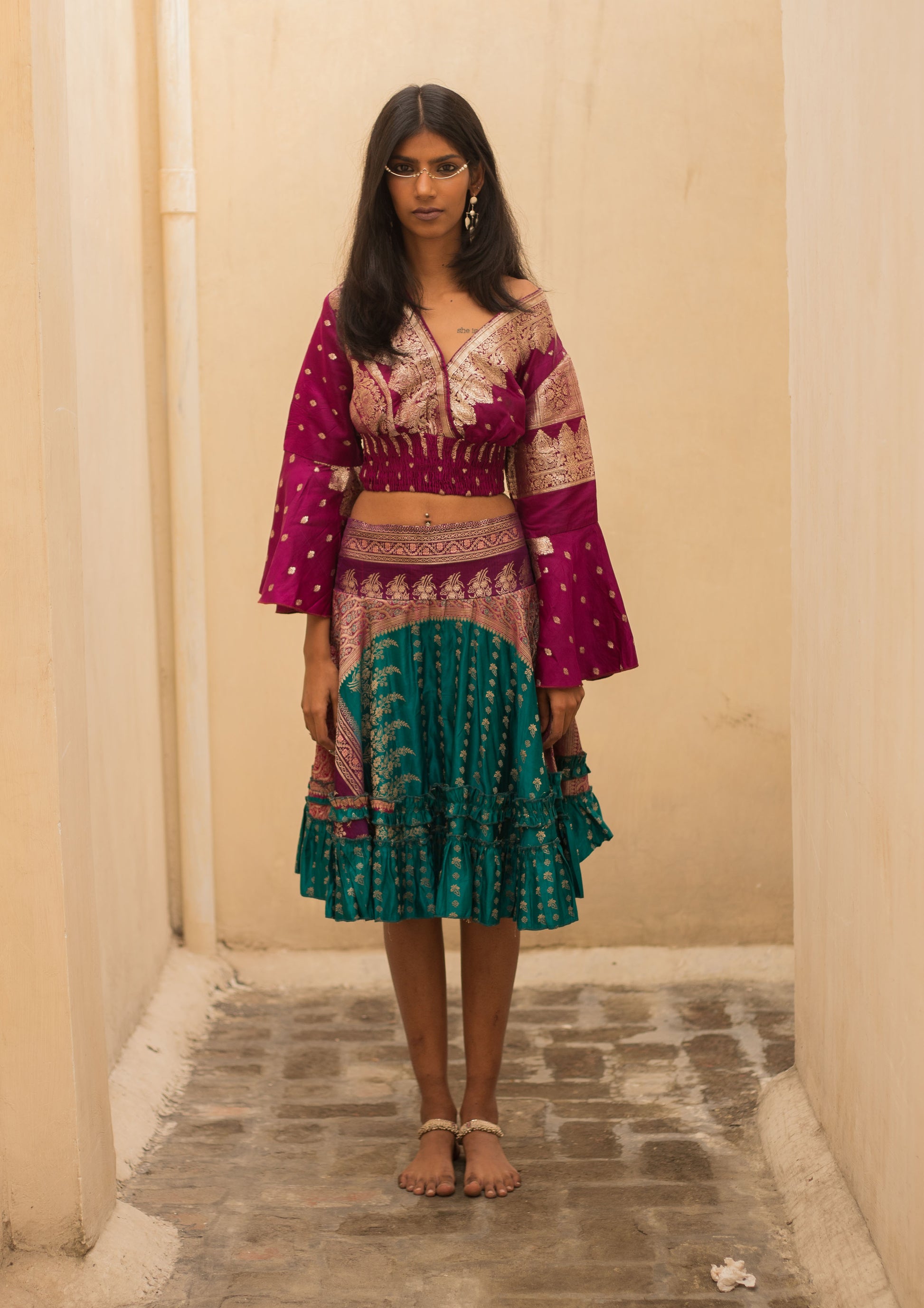Silk brocade skirt set is a sophisticated ensemble featuring a coordinated top and skirt crafted from luxurious silk brocade fabric. The fabric is rich in texture with intricate, raised patterns that add a subtle shine and depth. Typically, the set includes a fitted or tailored top and a contras skirt, often in classic circular cuts styles. Designed in deep, jewel tones or metallic hues, this set offers an elegant, cohesive look perfect for formal occasions, blending traditional artistry with modern elegance.
